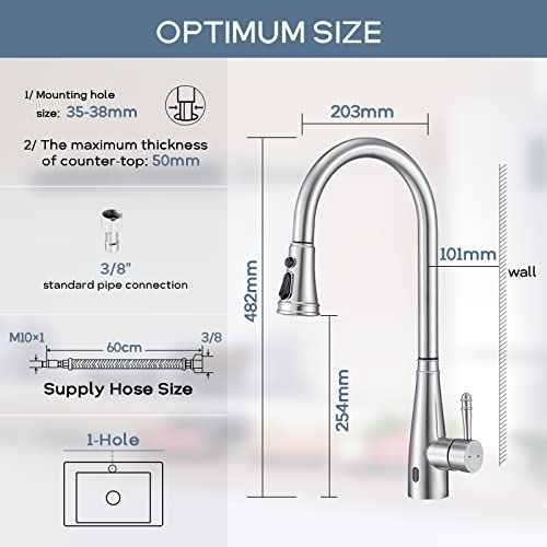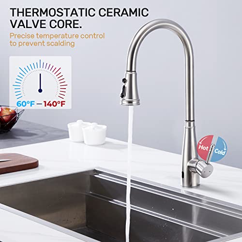 【MATERIALI DI ALTA QUALITÀ】 Touchless sensor rubinetti per lavello da cucina realizzati in acciaio inossidabile 304, conforme a NSF, tubo PEX resistente alle alte temperature, valvola a cartuccia in ceramica premium, tecnologia di tenuta multistrato per il collegamento. Superfici superiori resistenti alla ruggine e alla corrosione garantiscono perdite d'acqua per 10 anni.