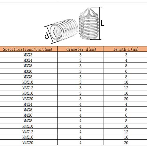 Yudesun Ferramenta Strumento Chiodi Elementi di Fissaggio Punta a Cono Acciaio Inossidabile Viti Senza Testa - Esagono Incassato Tazza Filettatura Metrica Chiave a Brugola a Bussola Vite M3 M4