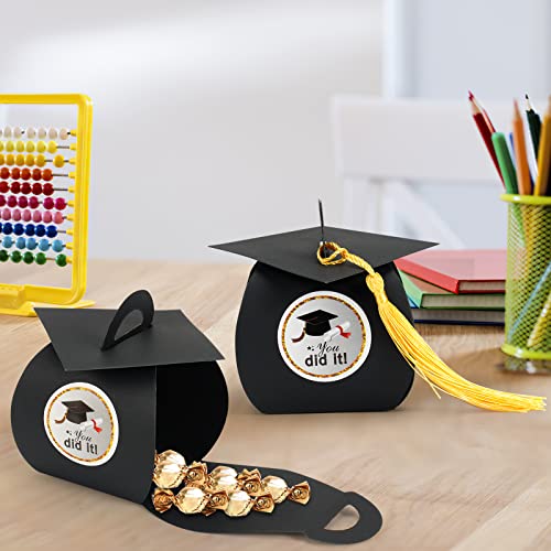 【Scatole regalo per cappelli di laurea】 Otterrete 24 pezzi scatole regalo a forma di cappelli di laurea, 24 pezzi nappe gialle e 24 fogli di adesivi. La grande quantità è sufficiente per voi per soddisfare le varietà di esigenze del partito, gli studenti e i vostri amici si innamoreranno di loro