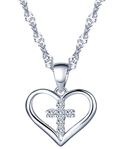 Yumilok Collana in argento Sterling 925 con ciondolo a forma di croce con zirconi e ciondolo a forma di cuore per donne e ragazze