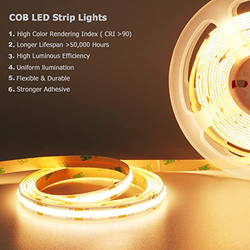YUNBO 12V COB Striscia LED Bianco Caldo 3000K, CRI 90+ 5M Alta Densità 480LED/M Alta Luminosità 4000Lm Flessibile Tagliabile IP20 Non impermeabile Luci a LED per Casa Camera Cucina