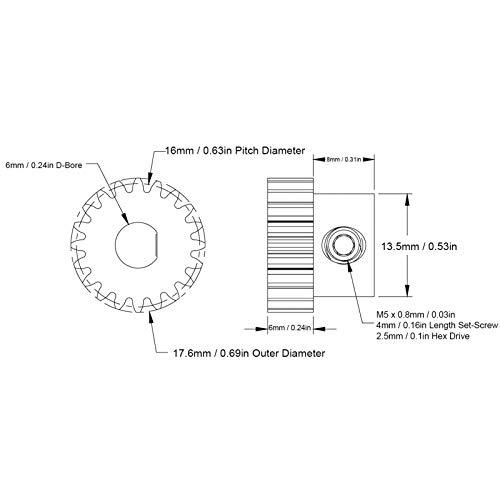 Il pignone a 20 denti con foro a D da 6 mm si adatta perfettamente all'albero a D da 6 mm per creare una trasmissione positiva.