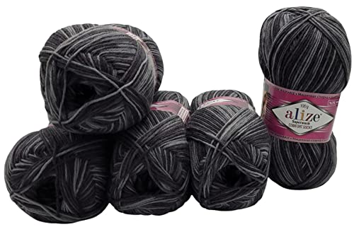 Yunteks Gomitolo di lana per calze, 500 g, multicolore, 75% lana vergine, 5 x 100 g, per calze a maglia e calze (nero grigio 7676)