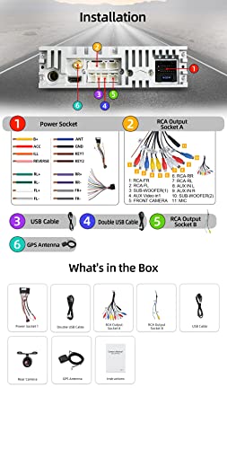 【CONTENU DE LA BOÎTE】 2 x Presa di corrente / 1 x Presa di uscita RCA A / 1 presa di uscita RCA B / 1 x antenna GPS / 2 x cavo USB / 1 x antenna radio / 1 x Canbus / 1 x telecamera per retrovisione / 1 x manuale utente