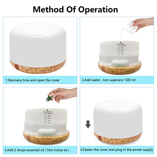 【Diffusore d'acqua da 500 ml】 Il diffusore di olio essenziale ha un ampio serbatoio dell'acqua da 500 ml, facile da pulire. Questo diffusore elettrico di fragranza pura che può funzionare fino a 12 ore in modalità nebbia bassa. Il diffusore di oli essenziali ad ultrasuoni è sia un diffusore di oli essenziali che un umidificatore. Il set include un alimentatore, che può essere utilizzato direttamente e facilmente, che è conveniente per la tua vita e una buona scelta per fare regali.