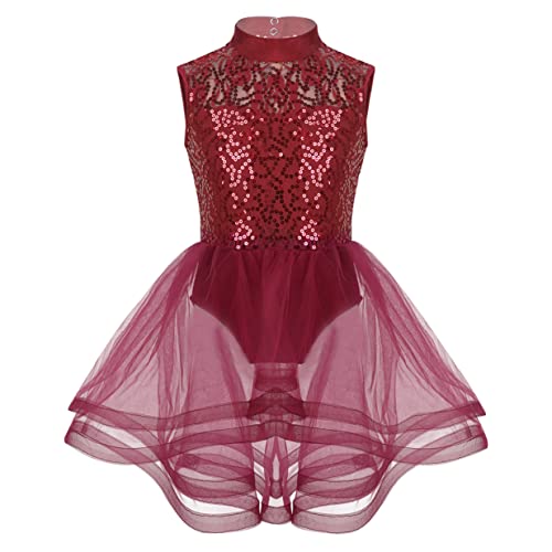 YUUMIN Vestito da Danza Classica Bambina Body da Pattinaggio Artistico Vestito da Balletto Ballerina Latino Abito da Ballo Paillettes Tuta Ginnastica Saggio Dancewear Borgogna 5-6 Anni