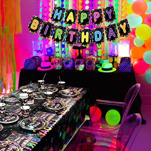 Ywediim Forniture per Feste al Neon Bagliore- Include striscioni Neon Happy Birthday, Tovaglie, Piatti, Tazze, Tovaglioli, Cannucce, per 20 Ospiti per Feste di Compleanno Neon Glow