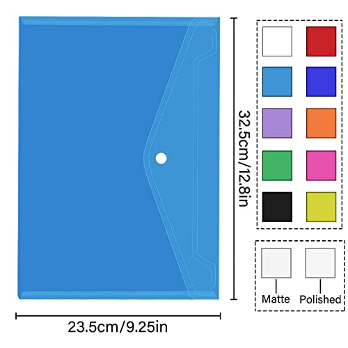 Buona Qualità: I raccoglitori di documenti A4 di alta qualità sono realizzati in materiale PP, non tossico e riciclabile. La tecnica di termosaldatura rende il bordo fermo e non facile da strappare. Ampia apertura per un facile riempimento e rimozione, fino a 100-150 fogli di carta A4 si adattano a una busta per documenti.