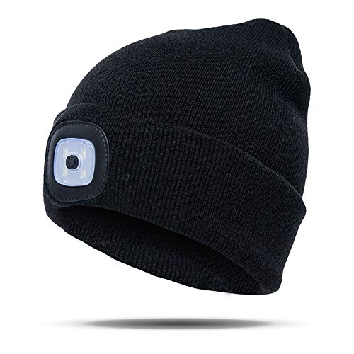 Cappello unisex in maglia con 4 luci LED ricaricabili integrate e rimovibili. Ha 3 impostazioni di intensità luminosa. Batterie ricaricabili USB incluse. Lavabile.