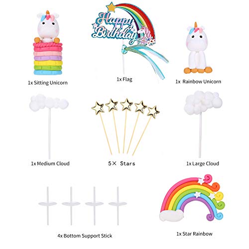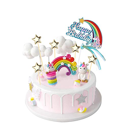 【Topper di buon compleanno per torte】inclusi 1 * Unicorno arcobaleno, 1 * Unicorno seduto, 1 * Arcobaleno, 5 * stella, 2 * nuvola bianca, 4 * asta di supporto inferiore, 1 * Topper buon compleanno. Si adatta meglio a torte da 6 pollici e 10 pollici.