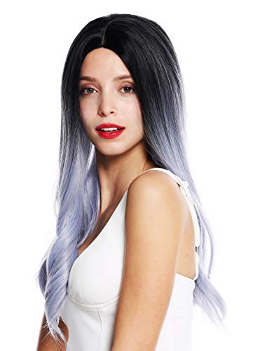 Fiabesca parrucca da donna. I capelli neri in corrispondenza della splendida riga in mezzo sfumano, in stile Ombre hair, in un incantevole e vivace mix di azzurro e grigio. Lunghezza: circa 60 cm.