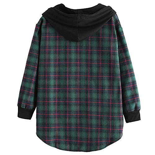 ZAFUL Giacca con cappuccio autunno Plaid Button Up Pocket Drop spalla allentato cappotto da donna, Verde scuro., XXL