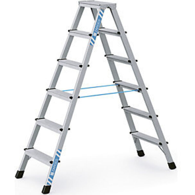 Scala a gradini professionale, anodizzata, salita su ambo i lati, 2 x 6 gradini. Fornitura = montato. Salita = su due lati. Versione da salita = gradini. Numero gradini = 2x6 pz. Materiale telaio = alluminio. Materiale gradini = alluminio con rivestimento antisdrucciolo. Profondità gradini = 80 mm. Peso = 6.1 kg. Caratteristiche = pieghevole. Portata = 150 kg. Altezza verticale = 1490 mm. Fissaggio dei gradini ai montanti con rivettatura tripla. Montanti e gradini in profilati estrusi di alluminio. Sicurezza antidivaricamento grazie a cinghie in perlon ad alta resistenza. Assemblaggio dei gradini ai montanti con rivettatura multipla. Tappi in plastica alle estremità. Profondità gradini 80 mm. Ideale per l'uso quotidiano.