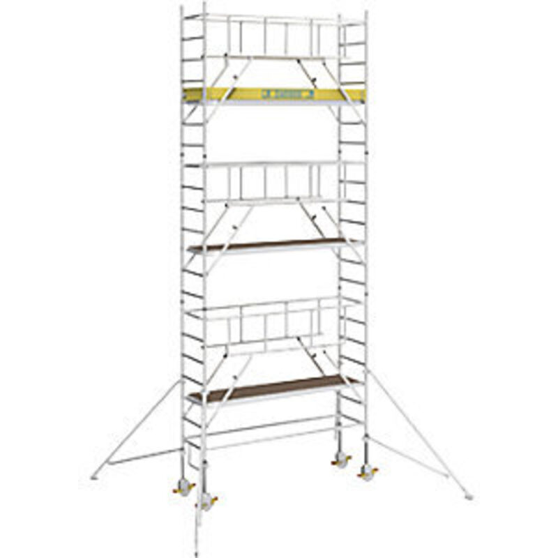 Trabattello mobile S-PLUS, piattaforma 1,80 x 0,60 m, altezza di lavoro 7,30 m. Fornitura = smontato. Larghezza piattaforma = 600 mm. Altezza piattaforma = 5300 mm. Lunghezza piattaforma = 1800 mm. Altezza di lavoro = 7.3 m. Altezza trabattello = 6.55 m. Peso = 186.2 kg. Materiale = alluminio. Portata = 202 kg. Dotazione ruote = 4 rotelle pivottanti con 4 fermi. Diametro ruote = 200 mm. Larghezza trabattello = 0.75 m. Lunghezza trabattello = 1.8 m. Versione = 4 stabilizzatori. Norma = DIN EN 1004-1. Tipo di prodotto = trabattelli mobili standard. Montaggio e smontaggio sicuri grazie alle ringhiere anteriori. Compensazione millimetrica dell'altezza mediante rotelle pivottanti con freno a perno. Altezze di lavoro possibili da 3,40 m fino a 13,20 m. Questo trabattello mobile professionale garantisce un lavoro sicuro a diverse altezze. Montaggio e smontaggio rapidi e sicuri grazie a una ringhiera anteriore (al posto di ringhiere e diagonali di rinforzo) e piattaforme a intervalli di 2 m.