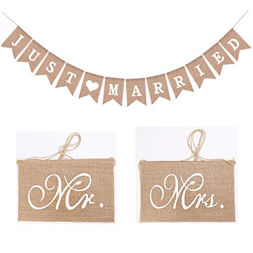 Zasiene Just Married Striscione in Iuta Mr e Mrs Bandierine Decorative per Sedie, per Matrimonio Vintage Matrimonio Decorazioni Wedding Decoration