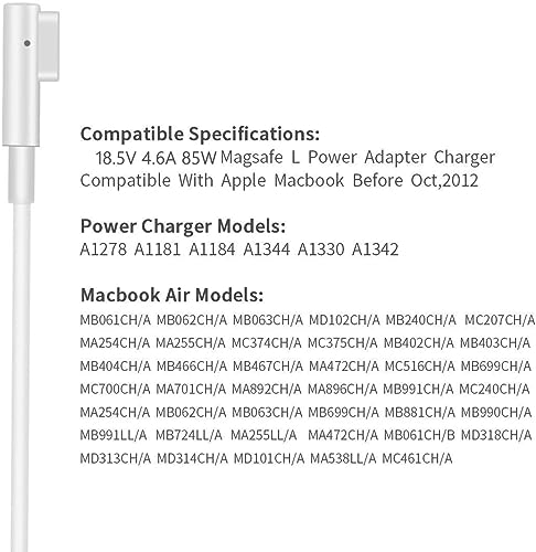 Zasunky Compatibile con Caricabatterie Mac Book Pro,Caricabatterie 85W Mags L-Tip Macbook pro Adatto per Mac Book Pro 13"e 15" e 17''(2006-2012),Modelle A1290 A1369 A1278 A1330 A1278ecc.