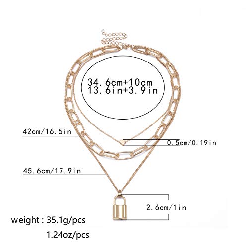DIMENSIONI: c'è una catena di estensione sul retro della collana, quindi la dimensione della collana è regolabile e facile da indossare. Non devi preoccuparti delle sue dimensioni. Quando lo indossi, ti renderà più affascinante. Il peso della collana con lucchetto dell'amore a tre strati è di circa 35,1 grammi (1,24 once). Per altre collane, fare riferimento alla tabella delle taglie per un confronto più semplice con il collo.