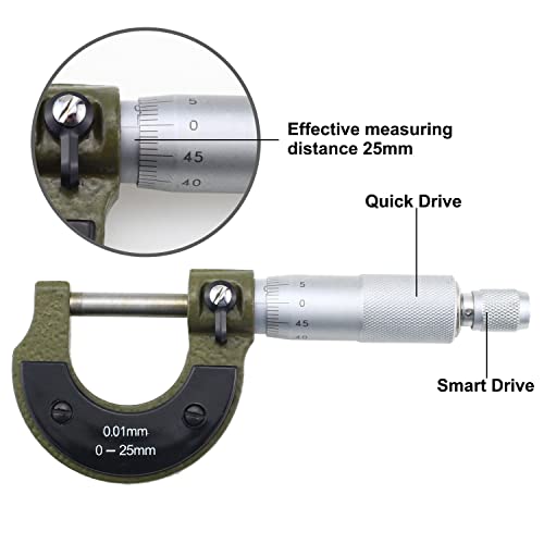 Scala di precisione:la gamma del micrometro è di 0-25 mm e ha una serratura per bloccare la lettura. L'incudine in carburo spesso garantisce una misurazione più accurata e un'incisione laser permanente per una lettura più chiara con incudine dura.graduazione nitida, chiara, facile da leggere.