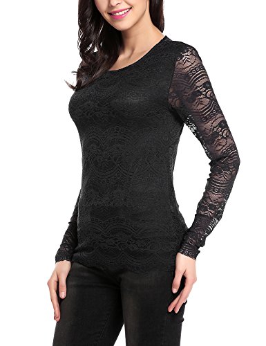 Zeagoo - Maglietta da donna a maniche lunghe, in pizzo, girocollo, con pizzo floreale