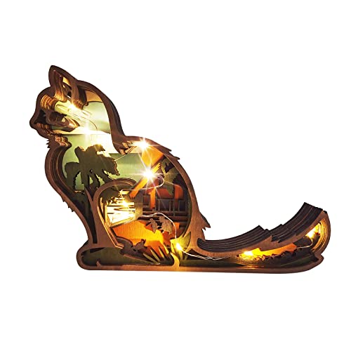 ZEARLY Luce vuota creativa - Lampada vuota a forma di gatto, ornamento di luce cava animale in legno, lampada vuota a LED per decorazione domestica camera da letto ufficio, 18 cm