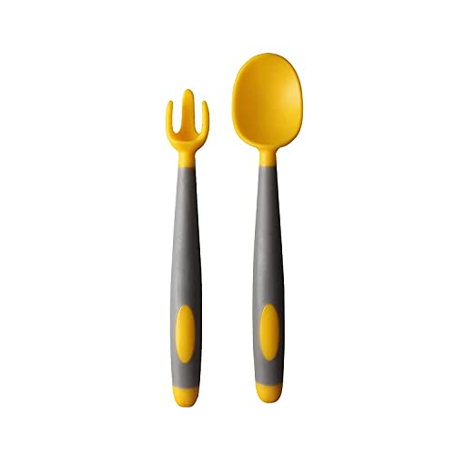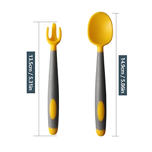 Zeaye utensili bambino cucchiaio set forchetta con case sicure Babies alimentazione infantile cucchiaio Formazione resistente al calore morbido auto-alimentazione flessibile cucchiaio (2Giallo-grigio)