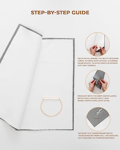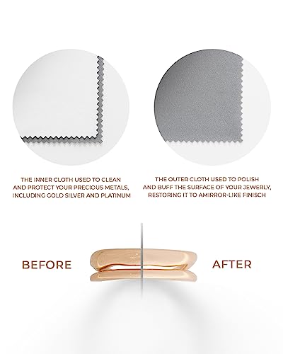 PANNO A DUE STRATI: Mentre la parte interna del panno pulisce dalla sporcizia e rimuove l'ossido dai vostri gioielli preferiti, monete, orologi, piatti od altri bei metalli. La parte esterna grigia morbida del panno lucida delicatamente la superficie dei gioielli, ripristinando la rifinitura come se fosse uno specchio ed evitando vengano danneggiati.