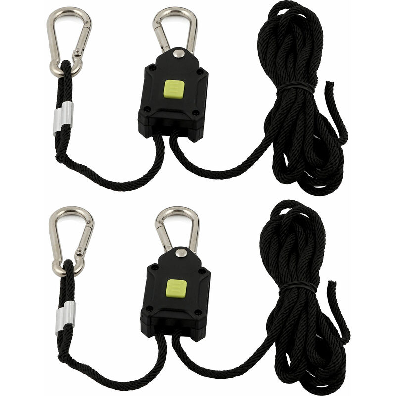 Cricchetto a corda Zelsius (2 pezzi), caricabile fino a 68 kg per coppia, paranco a corda manuale, paranco a presa. I cricchetti Zelsius sono ideali per appendere lampade, riflettori, ventilatori e filtri e molto altro nelle grow box e nelle tende da coltivazione. Ma anche nel settore del fai-da-te e dell'hobbistica le possibilità di utilizzo sono molteplici. Il materiale della corda in polipropilene intrecciato è estremamente resistente agli strappi e i Rope Ratchets possono quindi sopportare carichi fino a 68 kg per coppia e offrono numerose possibilità di applicazione. Grazie ai 4 moschettoni, si montano in modo facile e veloce e sono subito pronti all'uso. Con l'aiuto della funzione a cricchetto, l'oggetto sospeso può essere comodamente posizionato in altezza e bloccato in modo sicuro. Lo sblocco ergonomico a pulsante consente di impostare le distanze in modo ottimale e di regolarle in modo rapido e semplice in qualsiasi momento. Quando le lampade sono fissate, le giovani piante