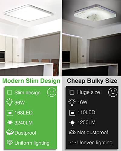 【Emissione di Luce Uniforme】La lampada led soffitto utilizza 168 chip LED di alta qualità e tecnologia di emissione laterale aggiornata per rendere uniforme l'effetto luminoso, emette luce bianca naturale 5000K, Ra>80, illuminazione grandangolare 120 ° e plastica bianco latte il paralume può prevenire una scarsa riflessione della luce. La luce soffusa non ha sfarfallio né vertigini, che possono proteggere efficacemente gli occhi.