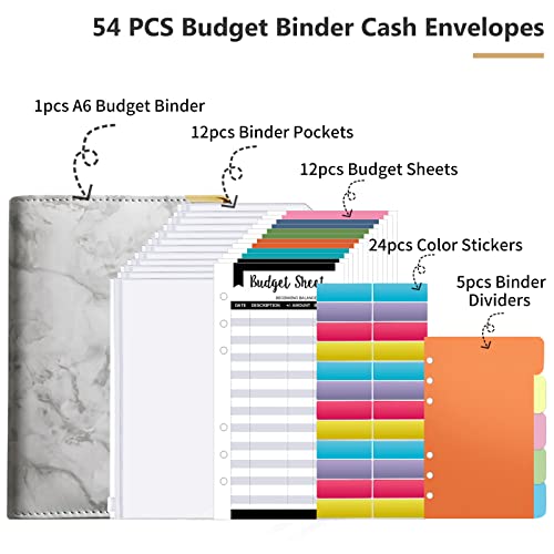 【A6 Classificatore ad anelli Planner di budget】 Sistema di buste per contanti risparmio domestico manuale per uso quotidiano: A6 binder copertina + 12*fogli di bilancio + 12*piccola trasparente tasca per ripieno cash + 24*etichette colorate + 5*separatore, marmorizzazione, cover in pelle PU, hasp magnetica, con penna foro e schede slot, tutti gli accessori sono confezionato singolarmente in un unico sacchetto, pulito e ordinato, ridurre il verificarsi di piegature di pagine interne e borse;