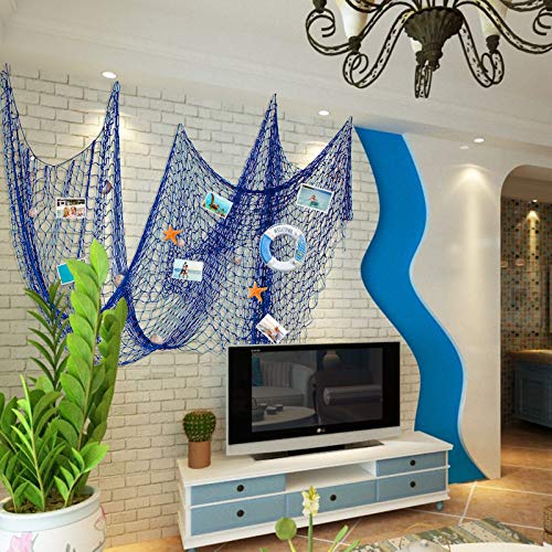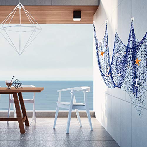 ZERHOK Rete da Pesca Decorativa,Rete da Pesca Decorativa da Parete e 4 pz Gancii Adesivi Materiale di Cotone Blu Decorazione a Tema Marino Camera da Letto Ristorante Caffè Partito