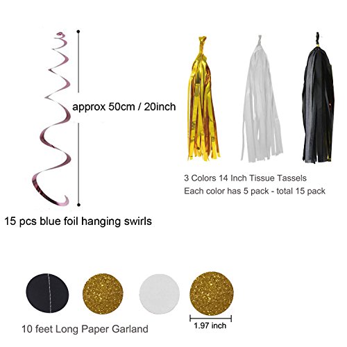 Confezionato Include 56 Decorazioni PZ - 10pcs Pendente Swirls (nero e oro) + 20pcs Palloncini (nero e oro) + 15pcs nappa (nero, oro e bianco) + 2pcs 2m cerchio di carta ghirlanda + 9pcs carta Pom Poms (nero, oro e argento).