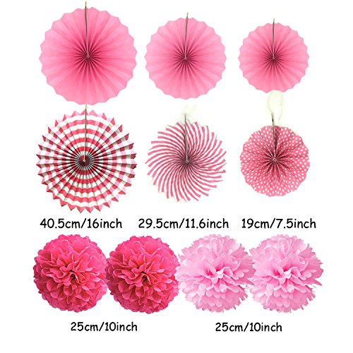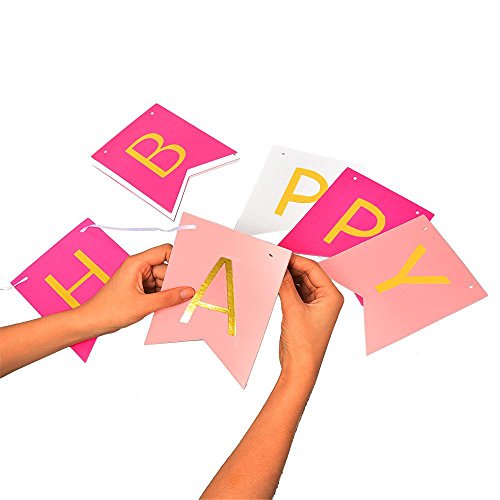 Include: 13 bandierine rosa ("HAPPY BIRTHDAY"), 2 pompon di carta rosa, 2 pompon di carta rosa chiaro, 6 ventagli di carta rosa, 10 palloncini rosa e 10 palloncini bianchi per feste di compleanno;