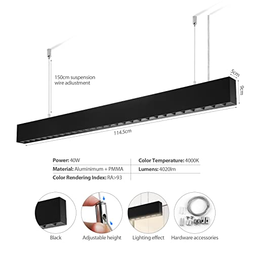 Zewanny Luce a sospensione LED 120 cm Ciondolo Ufficio Tavolo da pranzo, 40W 4000K Moderna lampada a sospensione Altezza regolabile per il soggiorno, cucina Sala da pranzo Lampada (Downlight, Nero)