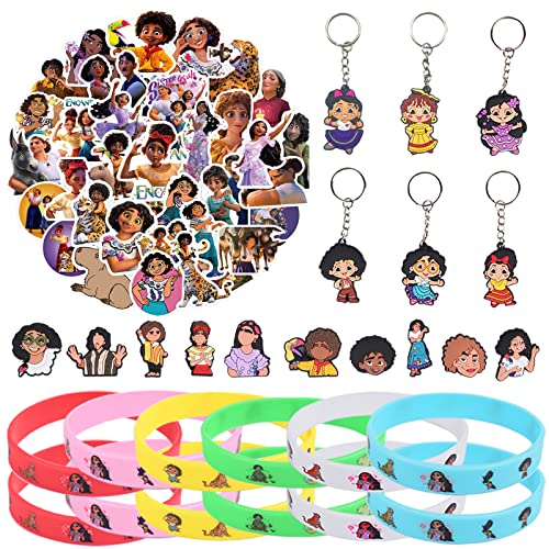 ZeYou 78 pezzi Encanto Party pensierini per bambini, Encanto Compleanno Party Decoration contiene 12 bracciali in silicone, 50 adesivi Encanto, 6 portachiavi e 10 ciondoli per scarpe