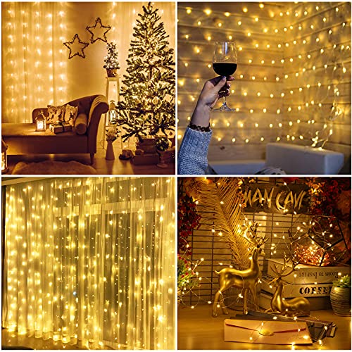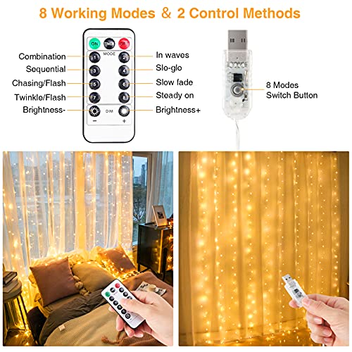 ZEYXINH Tenda Luminosa, 3x3M 300LED Tenda Luminosa Esterno, Porta USB 8 Modalità Impermeabile Luci Tende con Telecomando per Decorazione Interni ed Esterni di Natale, Matrimonio, Festa, Bianco Caldo