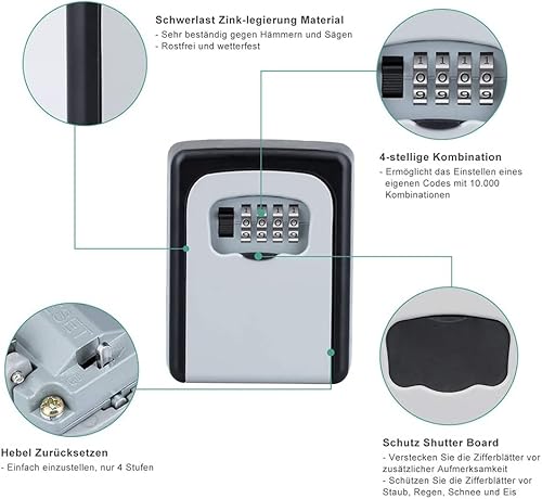▶ ALTA SICUREZZA: Corpo in lega di zinco ad alta resistenza montato con viti di montaggio per impieghi gravosi da 4 x 1 pollice all'interno, offre una resistenza extra a martellamento, segatura e leva. Le 4 cifre ripristinabili consentono di impostare il proprio codice con 10.000 opzioni uniche, garantendo la massima tranquillità che le chiavi siano archiviate e protette in modo sicuro.