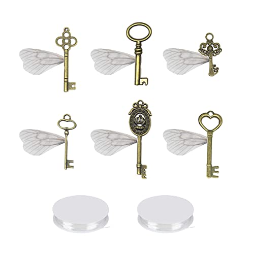 La confezione contiene: 46 pezzi chiavi vintage+ 50 pezzi ali di libellula + 2 rotoli di filo elastico di cristallo