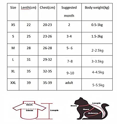 【Informazioni sulla taglia】 La taglia dei vestiti del gatto deve essere selezionata in base al peso dell'animale, alla misura del torace, del collo e della schiena. Conferma la taglia e acquista. I vestiti per gatti sono fatti a mano. Il panno a volte sarà esaurito, se questo è il caso Ti contatteremo in tempo, ti preghiamo di prestare attenzione al controllo della posta.