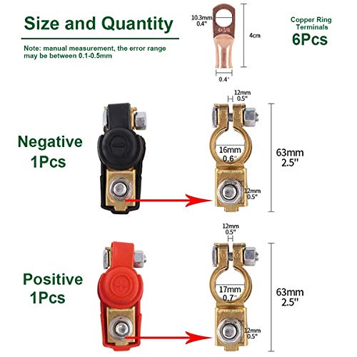 ★ Dimensioni: include una coppia di connettori della batteria e 6 terminali ad anello in rame, peso leggero. Positivo: 17 mm / 0,67 pollici, negativo: 16 mm / 0,63 pollici, terminale ad anello in rame: 40 x 9,5 mm / 1,6 x 0,38 pollici.