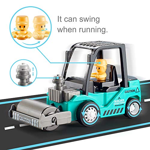Un set di 4 camion: tra cui carrello elevatore,escavatore,rullo compressore e bulldozer. Il braccio di sollevamento e la tramoggia possono muoversi su e giù in modo flessibile. Questi divertenti veicoli da costruzione terranno impegnati i bambini e offriranno maggiori opportunità di gioco.