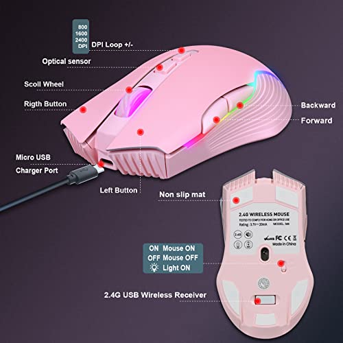 Zienstar-Mouse da Gioco Wireless da 2,4 GHz con Retroilluminazione RGB,7 Pulsanti,Batteria Ricaricabile da 500 mAh (Rosa)
