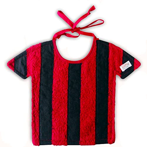 Bavaglino fatto a mano a forma di maglia da calcio a righe rosso nero ;