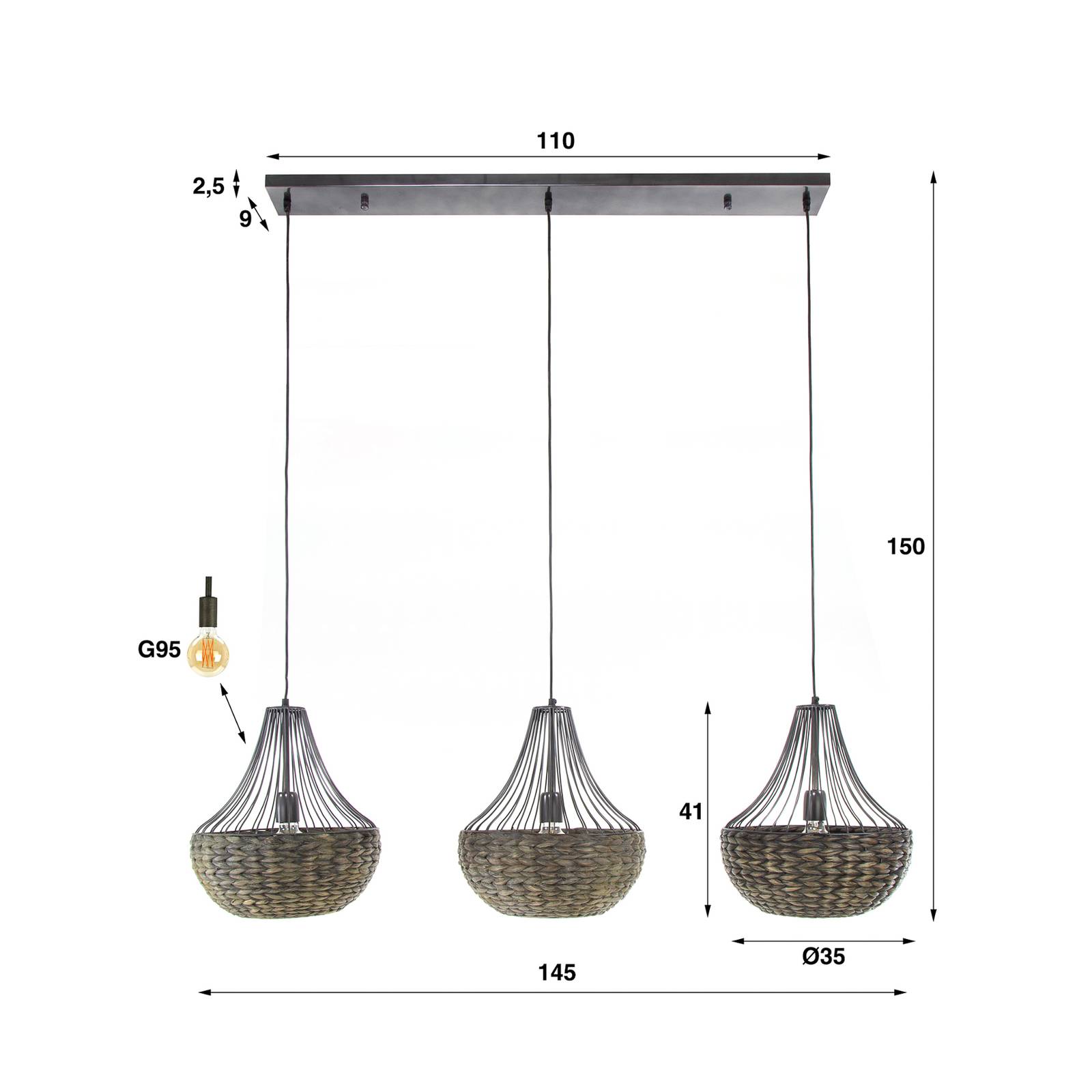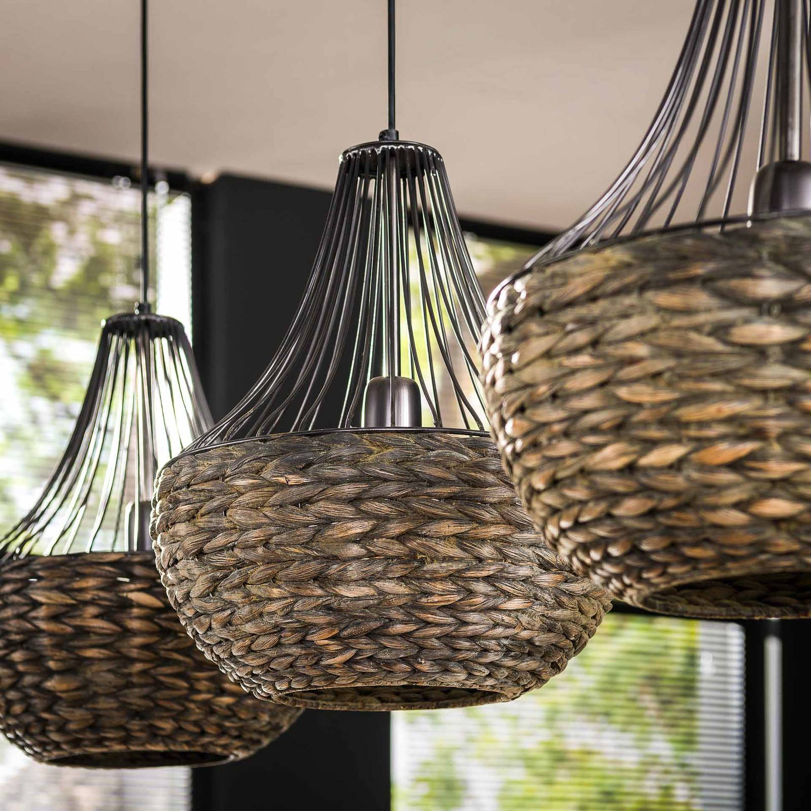 Lampada a sospensione Irmara con tre paralumi conici La lampada a sospensione Irmara colpisce per la naturale eleganza dei giacinti d'acqua in un'armoniosa combinazione di colori nero e marrone scuro. Questa lampada crea accenti di stile nella sala da pranzo e crea un'atmosfera che invita a socializzare in modo rilassato e a stimolare la conversazione. Con la lampada a sospensione Irmara, la luce diventa un elemento di design che trasforma gli ambienti e influenza gli stati d'animo in modo mirato.