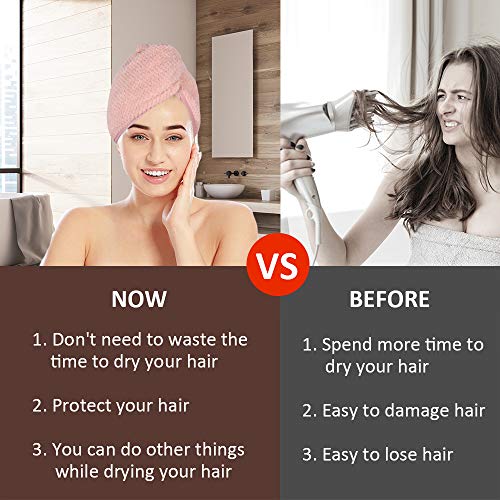 Super assorbente: gli asciugamani da bagno sono realizzati in tessuto di microfibra di alta qualità che assorbe l'acqua, privo di sostanze che potrebbero danneggiare i capelli. L'asciugamano per capelli è estremamente morbido e leggero, che protegge i capelli lontano dall'asciugacapelli e dalle lesioni tradizionali degli asciugamani, riduce l'effetto crespo e la rottura, rende la consistenza dei capelli più liscia e lucida.