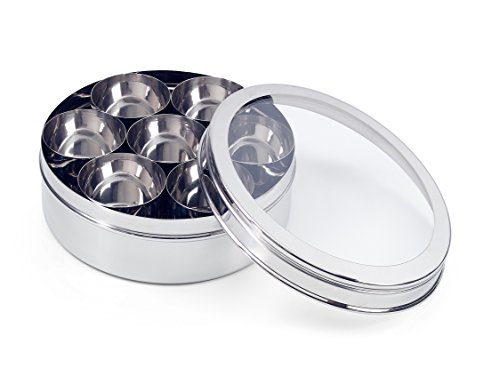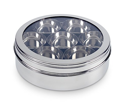 Zinel - Scatola per spezie/Masala Dabba con 7 compartimenti e Coperchio in Acciaio Inox, 18 cm