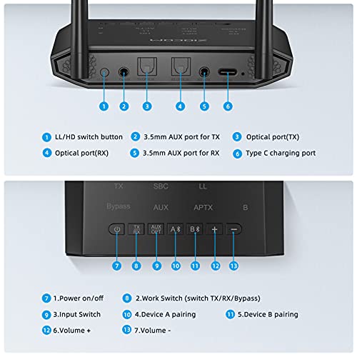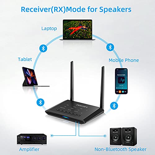[Modalità di Trasmissione e Ricezione 2 in 1]: Modalità di trasmissione: trasforma televisori, PC, lettori CD, iPod, MP3/MP4 non Bluetooth in trasmettitori Bluetooth e trasmette l'audio alle cuffie Bluetooth e agli altoparlanti Bluetooth;