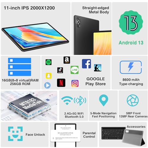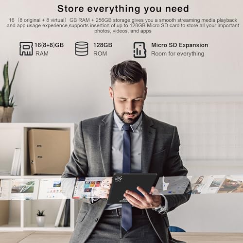 〖16GB RAM+256GB ROM/TF 1TB+5G WiFi〗:Tablet Android 13 ha un'enorme capacità integrata di 16 GB (8+8) di RAM + 256 GB di ROM, espandibile fino a 1 TB con una scheda SD, che consente di utilizzare le app e il multitasking in modo più fluido e di memorizzare un gran numero di file;