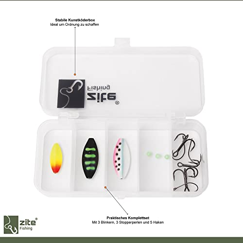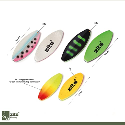 Zite Fishing Inline Spoon Set da 13 pezzi, indicatore di direzione per trota, pesce persico, esca ultra leggera, 2 - 3,5 g, con scatola per esche ganci, perline di gomma (neon