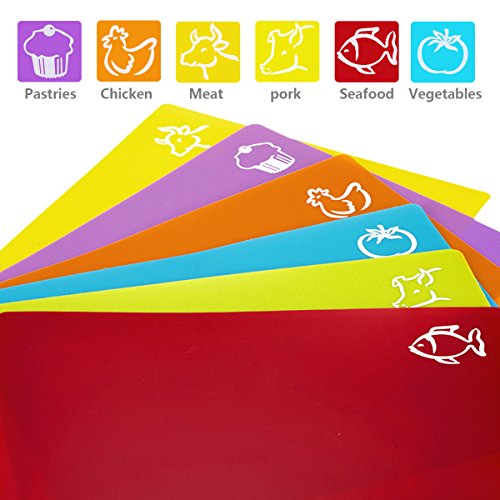 Facile da distinguere: I simboli di cibo ed i colori sono ben disegnati per riconoscere i prodotti diversi, 6 pezzi set taglieri di flessibili colorati evita la contaminazione incrociata, ed è più igienico. I dimensioni sono 38x30,5cm, sono adatti quasi tutti tagli in cucina.