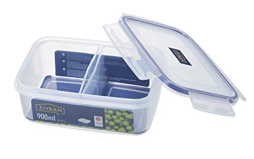 ZIVAAN - Contenitore per cibo rettangolare con due scompartimenti, impilabile, sottovuoto e a tenuta stagna, in polipropilene e silicone, 900 ml, trasparente e blu navy, RD3